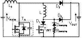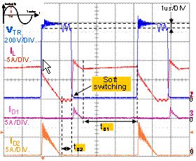 從理論上講,因?yàn)樗械拈_關(guān)損耗都被消除,零壓轉(zhuǎn)換(ZVT)是功率因數(shù)校正(PFC)應(yīng)用最理想的拓?fù)?。此外,不管輸入和輸出功率如何變化,這種電路都能正常工作。然而,在實(shí)際應(yīng)用中,升壓二極管DB的反向恢復(fù)電流對(duì)零壓轉(zhuǎn)換電路的影響非常明顯,致使電感和最小占空比都受到一定程度的限制。因?yàn)樾【€圈L上的重置電流,D2 的反向恢復(fù)電流包含高應(yīng)力電壓和寄生阻尼振蕩。最后,PN二極管的動(dòng)態(tài)特性影響零壓轉(zhuǎn)換(ZVT)電路的總體能效,因?yàn)檫@個(gè)晶體管的導(dǎo)通時(shí)間應(yīng)該增加,而且為降低半導(dǎo)體器件遭受的電應(yīng)力,必須增加一個(gè)有損緩沖器。