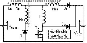 這個(gè)創(chuàng)新的電路是按照軟開關(guān)標(biāo)準(zhǔn)設(shè)計(jì)的,如圖4所示,為恢復(fù)小線圈L貯存的電能,在升壓線圈LB 附近新增兩個(gè)二極管 D1和D2 和兩個(gè)輔助線圈NS1和NS2 。