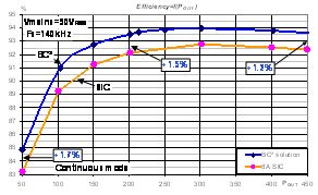 一旦功率因數(shù)校正器進(jìn)入斷續(xù)模式(<100 W),碳化硅二極管與BC²電路的能效相同,如圖8所示。