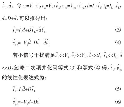 圖6給出圖5利用平均電路法建立的非隔離負(fù)電壓Buck開關(guān)電源CCM大信號模型。設(shè)Vi為輸入電壓的穩(wěn)態(tài)值,Vo為輸出電壓的穩(wěn)態(tài)值,Vpc為受控電壓源兩端電壓的穩(wěn)態(tài)值,Ii為輸入電流的穩(wěn)態(tài)值,IL為輸出電感電流的穩(wěn)態(tài)值,D為占空比的穩(wěn)態(tài)值。