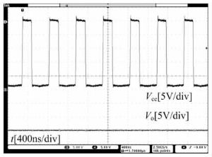 圖12給出了滿載情況下電源控制器LT1935內(nèi)部功率三極管集電極輸出電壓的波形??梢娫跐M載時系統(tǒng)不會產(chǎn)生過高的峰值電流,電感電流的波動小,即輸出紋波電流得到很好的抑制,有利于非隔離負(fù)電壓DC/DC開關(guān)電源的高效率工作和帶負(fù)載能力。同時系統(tǒng)的開關(guān)頻率很高,反饋回路的帶寬得到了保證。