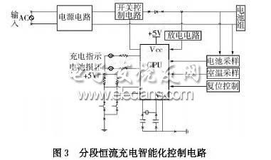 分段恒流充電智能化控制電路如圖3 所示。該電路采用CPU 控制,可對充電電池和充電環(huán)境溫度進(jìn)行檢測,對電池充電進(jìn)行計時,采樣充電過程中電池的電壓和電流,對分段恒流充電過程進(jìn)行控制。