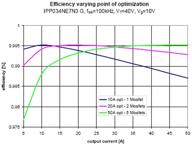 為闡明這個問題,圖4顯示了不同優(yōu)化方法得到的效率。圖中所示效率曲線為,當變壓器電壓為40V、柵極驅(qū)動電壓為10V、開關(guān)頻率為100kHz時計算得到的12V同步整流級的效率。在75V優(yōu)化表中選擇 IPP034NE7N3,按10 A MOSFET電流進行設(shè)計,所得到的優(yōu)化方案僅需一個MOSFET。如圖4所示,這種優(yōu)化方案能夠在低電流時實現(xiàn)很高的效率,而在高電流時效率卻極低。按50 A進行優(yōu)化設(shè)計,所得到的最佳方案則需要5個MOSFET。采用這種優(yōu)化方案,低電流時的效率將低得不能接受,但在滿負載時可以達到最高效率。因此,對該設(shè)置而言,最佳優(yōu)化方案是采用兩個并聯(lián)的MOSFET,從而獲得整體均衡的效率。
