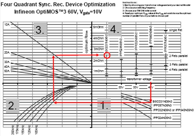 使用優(yōu)化表時,首先從次級變壓器電壓開始。在所用電壓值位置,畫一條垂直的直線。在兩條線相交處可以選出特定的MOSFET。通過一條水平的直線和一條垂直的直線,便可選擇開關(guān)頻率和MOSFET電流。如前面所討論,按最好從滿負載的20%至30%的電流值開始進行選擇。此時,可以在正Y軸上讀取最優(yōu)RDS(on)值。在第四個象限中,顯示了并聯(lián)MOSFET的最佳數(shù)量。在第四個象限中,必須選擇之前在第一個象限中選定的MOSFET型號。然后,按同樣的參數(shù)(變壓器電壓、開關(guān)頻率和電流RMS)對另一個型號的MOSFET重復(fù)執(zhí)行這個選擇過程。比較兩次選擇所得到的最優(yōu)RDS(on)值,最優(yōu)RDS(on)值越低的MOSFET所產(chǎn)生的功耗也越低,因而是更加高效的解決方案。