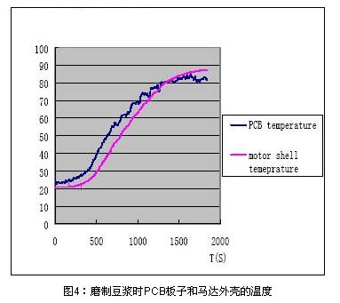 用上文所述的PPTC設(shè)計流程可以用在多功能豆?jié){機(jī)馬達(dá)防堵保護(hù)設(shè)計中,但這是往往會碰到選擇PPTC型號困難的問題,也就是說多功能豆?jié){機(jī)的馬達(dá)保護(hù)設(shè)計會較普通的小家電馬達(dá)保護(hù)復(fù)雜的多,圖4為磨制豆?jié){時PCB板周圍環(huán)境溫度和馬達(dá)外殼溫度的實測圖,可見控制電路PCB板PPTC周圍的環(huán)境溫度最高可以到達(dá)85C。由于豆?jié){機(jī)的PPTC最高環(huán)境溫度85度會比普通的小家電最高環(huán)境溫度要求高,這樣既要在85度的最大工作電流下能正常工作,還要保證在最低溫度0度的堵轉(zhuǎn)電流情況下能及時的保護(hù),相應(yīng)的就增大了設(shè)計難度。下面就具體的闡述此類多功能豆?jié){機(jī)馬達(dá)堵轉(zhuǎn)的保護(hù)設(shè)計方案。