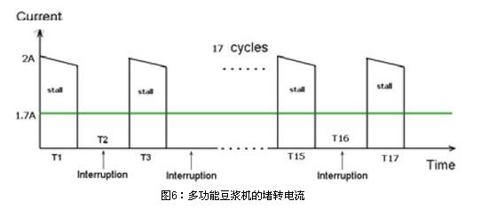 圖6為多功能豆?jié){機(jī)的堵轉(zhuǎn)電流。在榨水果的堵轉(zhuǎn)情況下,實測馬達(dá)的堵轉(zhuǎn)最大電流為2A,由于榨果汁時馬達(dá)也不是一直連續(xù)工作的,也是間隔一定時間工作,間隔時間是馬達(dá)工作6S,停3S,這樣換算成在一個榨水果完整工作周期內(nèi)平均電流是1.6~1.7A。在1.6~1.7A堵轉(zhuǎn)電流下,馬達(dá)堵轉(zhuǎn)需要保護(hù)的時間要求在150S內(nèi)。