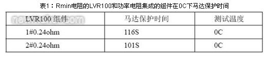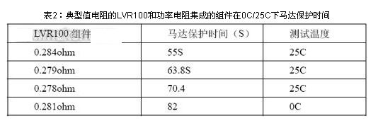 選取兩片Rmin電阻0.22ohm 的LVR100和功率電阻集成的組件,下面表1為馬達(dá)的保護(hù)時間。