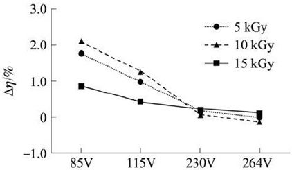 圖3 電子輻照后的APT13003E與常規(guī)的APT13003E在各個交流輸入電壓下系統(tǒng)平均效率增加百分比[page]