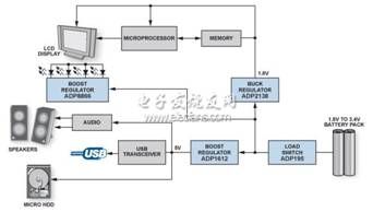 圖1顯示采用兩節(jié)串聯(lián)的AA電池供電的典型低功耗系統(tǒng)。電可用輸出范圍約為1.8 V至3.4 V,而IC工作時(shí)需要1.8 V和5.0 V 電壓。升壓轉(zhuǎn)換器可在不增加電池單元數(shù)量的情況下提升電壓,從而為WLED背光、微型硬盤驅(qū)動(dòng)器、音頻設(shè)備和USB外設(shè)供電,而降壓轉(zhuǎn)換器可為微處理器、內(nèi)存和顯示器供電。