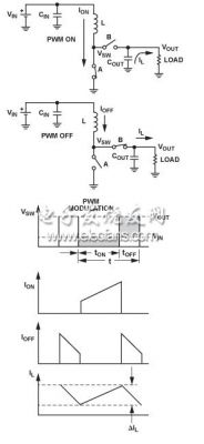注意,開關(guān)調(diào)節(jié)器既可以連續(xù)工作,也可以斷續(xù)工作以連續(xù)導(dǎo)通模式 (CCM), 工作時(shí),電感電流不會(huì)降至0;以斷續(xù)導(dǎo)通模式 (DCM),工作時(shí),電感電流可以降至0. 電流紋波,在圖2中顯示為ΔIL 使用公式ΔIL = (VIN × tON)/L.計(jì)算。平均電感電流流入負(fù)載,而紋波電流流入輸出電容。