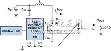 使用肖特基二極管代替開關(guān)B的調(diào)節(jié)器定義為異步 (或非同步), 調(diào)節(jié)器,而使用FET作為開關(guān)B的調(diào)節(jié)器定義為同步調(diào)節(jié)器。圖3中,開關(guān)A和B已分別使用內(nèi)部NFET和外部肖特基二極管來實(shí)施,從而形成異步升壓調(diào)節(jié)器。對(duì)于需要負(fù)載隔離和低關(guān)斷電流的低功耗應(yīng)用,可添加外部FET,如圖4所示。將器件的EN引腳驅(qū)動(dòng)至0.3 V以下便可關(guān)斷調(diào)節(jié)器,使輸入與輸出完全斷開。