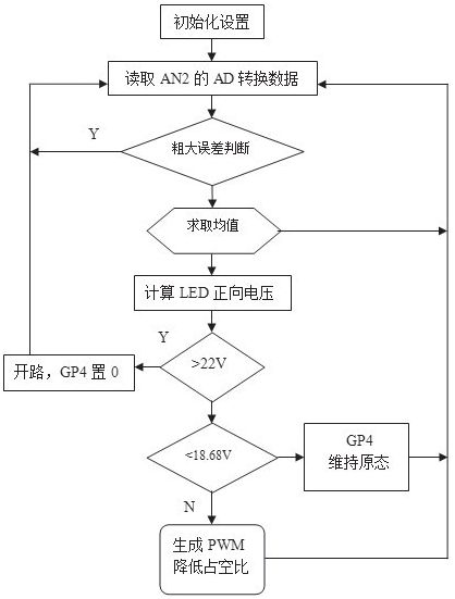 PIC12F675初始設(shè)置GP4輸出高電平,如測(cè)得LED正向電壓在合理范圍內(nèi),則維持高電平輸出使LM3404正常工作;如LED正向電壓逐漸變低并低于設(shè)定值18.68V,則在GP4引腳輸出PWM信號(hào),其占空比可依次降低,直至LED正向電壓低于設(shè)定值。當(dāng)測(cè)得LED正向電壓很高時(shí)可判定輸出開路, PIC12F675可輸出低電平關(guān)閉LM3404的輸出。