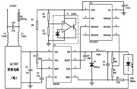 LM3404的輸出經(jīng)R5、R6分壓后輸入PIC12F675的模擬端口AN2,PIC12F675經(jīng)內(nèi)部AD轉(zhuǎn)換、計(jì)算獲取LED光源的正向電壓,根據(jù)設(shè)定值程序產(chǎn)生PWM信號(hào),通過(guò)GP4引腳接入LM3404的DIM端對(duì)其輸出功率進(jìn)行調(diào)整。