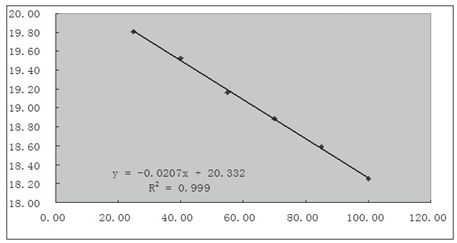 因測(cè)試時(shí)間較短,可以將測(cè)量時(shí)恒溫箱設(shè)置溫度近似等于LED光源的結(jié)溫。在600mA恒流的情況下,通過(guò)數(shù)學(xué)方法不難得出光源模塊正向電壓與結(jié)溫的關(guān)系。利用Excel工具,以溫度為X軸,平均值為Y軸,生成(X,Y)散點(diǎn)圖,選擇線性回歸分析類型則可生成如下趨勢(shì)圖和公式。