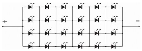 在實(shí)際應(yīng)用中,往往不需要確定LED結(jié)溫的特別精確的數(shù)值,此時(shí)可以用試驗(yàn)的方法確定整體燈具LED光源結(jié)溫的估算數(shù)值。以一個(gè)12W筒燈為例,光源部分由4并6串中功率LED組成,其電路連接形式如下: