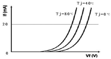 LED的伏安特性和其它二極管一樣具有負(fù)溫度系數(shù)的特點(diǎn),即在結(jié)溫升高時(shí)I/V曲線出現(xiàn)左移現(xiàn)象,如下圖所示。