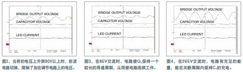 圖2顯示了在輸入電壓為150V 交流時(shí),不同周期部分的電壓。軌跡1是橋式整流電路的輸出。軌跡2是C1上的電壓,即斬波電路的輸出。軌跡3是電流檢測(cè)電阻上的電壓。這些軌跡清楚地表明,當(dāng)橋的輸出電壓增加到80V以上時(shí),斬波電路切換,限制了加在調(diào)節(jié)電路上的電壓。圖3顯示了輸入電壓為85V交流時(shí)的電壓。