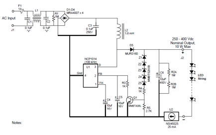 美國(guó)安森美公司加了一個(gè)功率因素校正芯片NCP1014的恒流二極管的電源,其電原理圖見圖12。