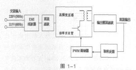 接入交流電網(wǎng)(50Hz ,220V AC 或者115VAC)經(jīng)EMI 防電磁干擾電源線濾波器,直接整流濾波變成直流,再經(jīng)變換器將直流電壓(275V 或172V)變換為數(shù)十KHz 或數(shù)百KHz的高頻方波或準方波電壓控制功率開關(guān)管,經(jīng)高頻率變壓器隔離、降壓(或升壓),再經(jīng)高頻整流濾波后輸出直流電壓,經(jīng)取樣、比較、放大控制PWM 調(diào)制器驅(qū)動功率開關(guān)管的占空比。從而可以得到穩(wěn)定的輸出電壓。