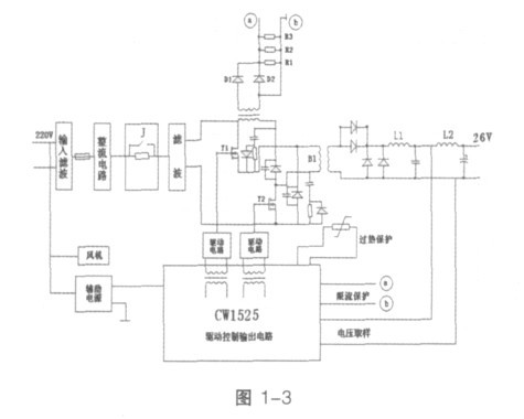 以上是開關(guān)電源基本原理和控制方式的介紹,結(jié)合我們實際工作中固態(tài)發(fā)射機開關(guān)電源控制方式以及理論理解,使我對大功率開關(guān)電源原理、整體控制方式有了進一步的認識?,F(xiàn)以5kW- 14CH 大功率合放式全固態(tài)電視發(fā)射機直流26V/100A 正激開關(guān)電源變換器的工作原理和維修方法來簡單介紹一下,如圖1- 3 所示: