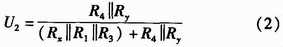 如圖2所示,U+和U-為被測線路的母線供電電壓,正常工作時兩母線間的電壓差Ux+y為440 V,且隨蓄電池內(nèi)阻變化。Rx,Ry分別為被測線路的正母線絕緣電阻和負母線絕緣電阻。正、負母線絕緣電阻反映的是64路的正、負支路的總體絕緣性能,等效于各個支路的正、負絕緣電阻的并聯(lián),正常時兩母線絕緣電阻>20 kΩ。Ux和Uy為正負母線對地電壓,大小隨正負母線的絕緣電阻變化,但兩母線電壓差恒定為Ux+y。為了檢測正負母線電壓Ux,Uy,Rx,Ry,系統(tǒng)采用了“平衡-不平衡檢測法”檢測母線電壓和母線絕緣電阻。計算公式如式(1)所示。