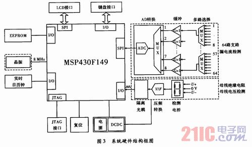 直流接地檢測系統(tǒng)采用低功耗處理器MSP430F149為硬件核心,外圍電路可分為數(shù)據(jù)采集模塊、人機交互模塊、處理器模塊。數(shù)據(jù)采集模塊負責檢測64路支路的漏電流、母線電壓、母線絕緣電阻;人機交互模塊負責進行液晶顯示和鍵盤輸入;處理器模塊負責協(xié)調(diào)整個系統(tǒng)的數(shù)據(jù)處理,數(shù)據(jù)存儲,人機交互等。具體的硬件結(jié)構(gòu)框圖,如圖3所示。