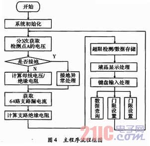 整個程序的編寫均由C語言完成,在程序設(shè)計中,采用了結(jié)構(gòu)化程序設(shè)計方法,使各個模塊程序相對獨立,便于程序代碼的維護、移植和升級。同時,這樣分離式的程序設(shè)計,降低了代碼的調(diào)試難度,縮短了調(diào)試周期。將與接地故障信息(如母線電壓,母線絕緣電阻,支路絕緣電阻,接地支路號等)密切相關(guān)的數(shù)據(jù)放在一個結(jié)構(gòu)體里,便于掉電存儲與回放顯示。系統(tǒng)的主程序流程圖,如圖4所示。