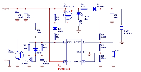PT7M7433T是上海百利通公司最新設(shè)計(jì)的極高精度的一系列電壓檢測(cè)器的其中一款,其檢測(cè)精度在0-Vcc (5.5V)范圍內(nèi)小于1mV,而且其批量IC的檢測(cè)值偏差<±2.5%,這樣完全保證了批量產(chǎn)品的性能一致性和極高的總體性能,我們利用其配合少量外部電路即可組成相當(dāng)簡(jiǎn)單的鋰電池充電線路。