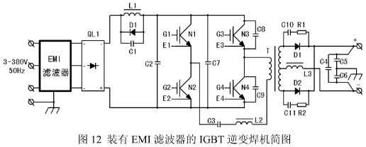 圖 12 是裝有 EMI 濾波器的 IGBT 逆變焊機(jī)原理簡圖。為了減少對相鄰設(shè)備的干擾和減少高頻電磁輻射對焊工健康的影響,在焊機(jī)輸出端也接了濾波器,其中 C4 用于輸出差模干擾的濾出,C5、C6 用于共模干擾濾出。