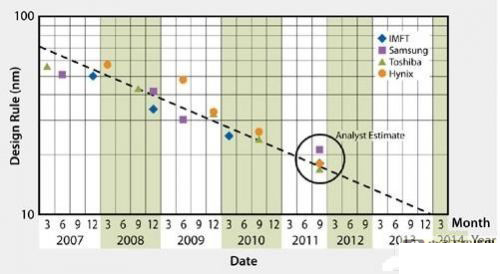 雖然數(shù)碼相機(jī)歷來需要很大的存儲(chǔ)容量,但對手機(jī)而言,這種要求只是在近幾年才變得重要起來。幸運(yùn)的是,固態(tài)存儲(chǔ)器的密度和容量在逐漸增加,其價(jià)格($/MB)和面積(mm2/MB)隨之大幅降低。從圖1可看出,在2011年,NAND閃存的制造工藝幾何尺寸可能突破25nm。