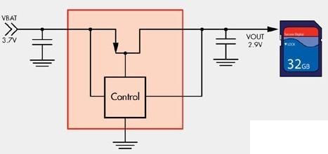 對于低速工作的小容量SD卡,耗電量常常小于100mA。假設(shè)鋰離子電池的額定工作電壓為3.7V,且存儲(chǔ)器的電源軌相當(dāng)高,則線性調(diào)節(jié)器就成為SD存儲(chǔ)器的電源選擇。不過,選定的線性調(diào)節(jié)器必須能以低壓降(LDO)方式工作,因?yàn)殇囯x子電池的有效電壓范圍在3.2至4.2V之間。