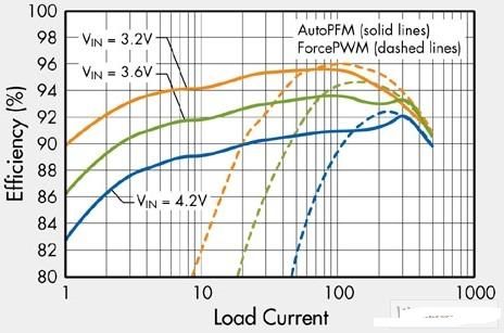 按照表1的計(jì)算,對于300mA的系統(tǒng),F(xiàn)AN5362能把功耗降至55mW;對于400mA的系統(tǒng),F(xiàn)AN5362能將功耗降至101mW。這些效率值根據(jù)所測得的FAN5362效率曲線而獲得。圖5顯示了AutoPFM(實(shí)線) 和 ForcePWM (虛線)的效率曲線。在優(yōu)化FAN5362效率的同時(shí),選擇3MHz作為額定開關(guān)頻率,因?yàn)樗軌蛱峁┏叽绾托手g的最佳權(quán)衡。從表1可看出,對于這種功耗敏感應(yīng)用,采用6MHz開關(guān)頻率時(shí)的功耗遠(yuǎn)遠(yuǎn)大于采用3MHz開關(guān)頻率時(shí)的功耗。
