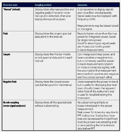 檢測(cè)模式是另一種幅度控制方式,可用于傳統(tǒng)的掃描頻譜分析儀,但不能用于基于FFT的分析儀??煞譃槠胀?、峰值、采樣或負(fù)峰值等模式,具體檢測(cè)模式?jīng)Q定了頻譜分析儀如何減少頻譜信息的,或者說(shuō)如何壓縮頻譜信息。