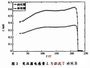 變壓器在中不僅能傳遞能量,同時(shí)還起到了電氣隔離的作用,變壓器的原邊與副邊線圈匝數(shù)比的不同可以達(dá)到升壓或降壓的作用。在模塊工作狀態(tài)下,由于磁芯的渦流效應(yīng),變壓器會(huì)產(chǎn)生很多的熱量,成為模塊熱量產(chǎn)生的主要來源。實(shí)驗(yàn)中首先測(cè)試了變壓器原邊和副邊線圈的電感量隨溫度的變化,如圖3所示,從圖3中可見隨著溫度的升高,線圈的電感量先增加,然后小幅下降,再小幅上升,在環(huán)境溫度為220℃以前,變壓器的原邊與副本電感量的整體趨勢(shì)是逐漸增加,當(dāng)溫度達(dá)到220℃,磁芯溫度達(dá)到居壁點(diǎn),線圈的電感量迅速降為零。對(duì)于不同磁芯材料的變壓器其居里點(diǎn)溫度有所不同,對(duì)于此類變壓器,可知居里溫度在220℃附近。當(dāng)變壓器溫度接近居里點(diǎn)時(shí),變壓器電感量會(huì)迅速減小,會(huì)導(dǎo)致輸出電壓迅速下降。