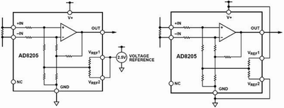雙極性輸出時(shí)AD8205可以測(cè)量流過采樣電阻上的雙向電流,這時(shí),輸出可以偏置到輸出范圍內(nèi)的任意位置。當(dāng)被檢測(cè)的正反兩個(gè)方向上的電流為等幅時(shí),其輸出必須偏置到滿量程輸出的中間位置。當(dāng)雙向電流幅值不對(duì)稱時(shí),輸出偏置可以對(duì)應(yīng)地偏離半量程位置。它的兩個(gè)參考輸入VREF1和VREF2分別連接一個(gè)內(nèi)部電阻RREF后接到同一個(gè)內(nèi)部偏置節(jié)點(diǎn),這兩個(gè)參考輸入端的操作方式完全相同。在兩個(gè)參考電壓輸入端接入對(duì)應(yīng)的電壓,即可完成對(duì)輸出的偏置。在雙極性輸出方式下,一般有以下兩種連接方式。