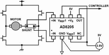 如圖5所示連接,AD8205在H橋馬達(dá)控制電路中作為控制回路的一部分,馬達(dá)和采樣電阻串連后放置在H橋的中間,通過檢測(cè)采樣電阻上的電壓,可以準(zhǔn)確地測(cè)量馬達(dá)當(dāng)前的電流及其方向。此時(shí),AD8205的輸出被設(shè)定成外部參考雙向的方式,這樣它可以測(cè)量H橋開關(guān)的雙向電流并同時(shí)監(jiān)測(cè)馬達(dá)的運(yùn)轉(zhuǎn)方向。由于地不是一個(gè)特別穩(wěn)定的參考電平,以地為參考將會(huì)導(dǎo)致測(cè)量的不準(zhǔn)確性。因此,這種測(cè)試方案要比以地作為參考電平的測(cè)試方法好的多。
