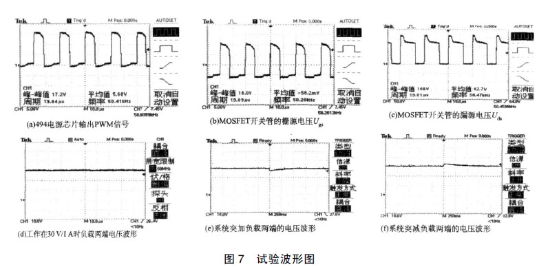 通過調(diào)壓器在供電電源端輸入110 V 的交流電壓, 使得系統(tǒng)穩(wěn)定的工作在30 V、1 A 的負(fù)載下, 觀察TL494 電源芯片輸出的驅(qū)動信號波形、MOSFET 開關(guān)管Ugs、Uds 、負(fù)載正常工作時的波形、以及突然加載、突然掉載情況, 其試驗(yàn)波形如圖7。