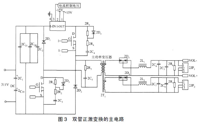 從圖3 可以看出, 電路結(jié)構(gòu)簡單, 容易實(shí)現(xiàn), 并在MOSFET 橋臂增加了霍爾傳感器, 以保證輸出反饋電流環(huán)的要求。為了增加電路的通用性, 設(shè)計的電路板增加了雙路輸出的功能, 只要改變變壓器的設(shè)計, 即可以完成多路輸出。當(dāng)兩個主功率開關(guān)管截止時, 原邊繞組的電壓極性相反, 使另外一橋臂的兩個二極管導(dǎo)通, 電壓被箝位在輸入電壓值。因此開關(guān)管承受的電壓與輸入電壓相同。在輸入電壓最大值低于350 V時, 開關(guān)管只需要選擇450 V 的耐壓值即可。這里我們選用N 溝道MOSFET , IRF830( 4. 5 A/ 500 V) 。