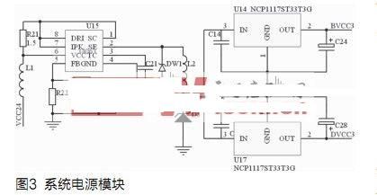 控制單元內(nèi)部單片機(jī)的供電為3.3V,其他芯片和模擬器件的供電在3V到10V之間??刂茊卧碾娫摧斎胧怯赏獠?a target="_blank" style="text-decoration:none;" >開關(guān)電源提供的。在生產(chǎn)現(xiàn)場,開關(guān)電源與水泵電機(jī)共用一路交流電,水泵在運(yùn)行過程中會引起開關(guān)電源的輸出波動,若不采取防浪涌措施勢必會影響到單片機(jī)的正常工作。根據(jù)上述分析設(shè)計(jì)系統(tǒng)電源模塊如圖3所示。電感L1起防浪涌保護(hù)作用;輸入電壓經(jīng)開關(guān)電源芯片MC34063后輸出12V電壓,然后通過兩個NCP1117ST33穩(wěn)壓芯片產(chǎn)生兩路3.3V電源分別給單片機(jī)和光電接收電路供電。