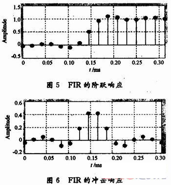 點(diǎn)擊“design filter”即可。值得注意的是,這里選擇filter order為15階,而不是所設(shè)計的16階濾波器。因為常數(shù)系數(shù)項h(0)=0。通過菜單“analysis”選擇“magnitude”和“phase response”即可得到圖3,圖4的特性顯示。“analysis”選擇“step response”和“im-pulse”可以得到圖5,圖6的響應(yīng)顯示??梢钥闯鏊O(shè)計FIR濾波器的階躍響應(yīng)和沖擊響應(yīng)比較接近理想狀態(tài)。