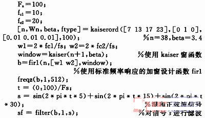 Matlab信號處理工具箱提供了各種窗函數(shù)、濾波器設(shè)計函數(shù)和濾波器實(shí)現(xiàn)函數(shù)。設(shè)計中利用Matlab提供的函數(shù)firl來實(shí)現(xiàn),編程則是直接調(diào)用這些函數(shù)簡單直觀的完成設(shè)計。調(diào)用格式:firl(n,Wn,‘ftype’,Window),其中n為階數(shù)、Wn為截止頻率、ftype是濾波器的類型、Window是窗函數(shù)。應(yīng)用凱塞窗的代碼如下: