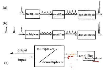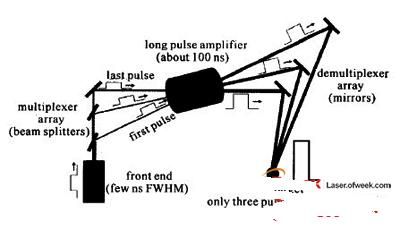 對于準分子激光放大器,由于激活介質(zhì)的上能態(tài)儲能時間很短,必須連續(xù)補充瞬態(tài)儲能(Em)才能獲得高能輸出,即E=EmT/t,其中T是增益時間,t是增益恢復時間。對于電子束泵浦的準分子激光放大器,增益時間可以長達200ns,T/t≈100,這意味著對于單個要放大的短脈沖,只能提取出很小一部分能量。為了持續(xù)提取出放大器中的儲能,通常使用光學多路編碼技術。