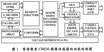 圖1示出了有源像素CMOS圖像傳感器(ActivePixel Sensor,APS)的功能結(jié)構(gòu)圖,其中成像部分為光敏二極管陣列(Photo Diode Array)。