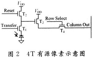轉(zhuǎn)移管T1被用來將光敏二極管連接至源跟隨器T3,并通過復(fù)位管T2與VDD相連。T3的柵極與T1和T2之間的N+擴(kuò)散區(qū)相連。與3T結(jié)構(gòu)的APS相比,減少了與T3的柵極相關(guān)的漏電流效應(yīng)。源跟隨器T3的作用是實(shí)現(xiàn)對(duì)信號(hào)的放大和緩沖,改善APS的噪聲問題。T4是用來將信號(hào)與列總線相連。其工作過程是:首先進(jìn)入“復(fù)位狀態(tài)”,T2打開,對(duì)光敏二極管復(fù)位;然后進(jìn)入“取樣狀態(tài)”,T2關(guān)閉,光照射到光敏二極管上產(chǎn)生光生載流子,并通過源跟隨器T3放大輸出;最后進(jìn)入“讀出狀態(tài)”,這時(shí)行選通管T4打開,信號(hào)通過列總線輸出。