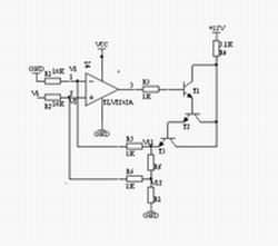電壓-電流轉(zhuǎn)換模塊由精密運(yùn)放與三個(gè)晶體管組成的達(dá)林頓管電路構(gòu)成。轉(zhuǎn)換電路利用晶體管平坦的輸出特性和深度負(fù)反饋電路使輸出電流穩(wěn)定,如圖2所示,此V/I轉(zhuǎn)換電路的帶負(fù)載能力強(qiáng),電流輸出范圍達(dá)0~3A。輸出電流Io經(jīng)反饋電阻Rf得到一個(gè)反饋電壓Vf,Vf= V11-V12,通過(guò)R5、R6加到運(yùn)算放大器的兩輸入端,設(shè)運(yùn)放兩端的電為V1、V2,Vi由單片機(jī)DAC輸出。因?yàn)槔硐脒\(yùn)放的輸入電流約等于零,且 V1=V2,則: