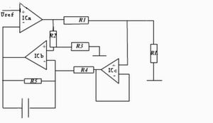 電壓-電流轉(zhuǎn)換模塊還有另外一種方案,即采用三個(gè)運(yùn)放構(gòu)成輸出電流可變的電流源,如圖3所示。輸出電流I=Vi/R1,為使R1兩端的電壓保持恒定,由差分放大器IC1b通過(guò)射隨器IC1c監(jiān)測(cè)R1兩端的電位,此電位經(jīng)IC1b的7腳加到比較器 ICa的反相輸入端與Vref比較,根據(jù)比較結(jié)果使比較器的輸出端變化,直到平衡為止,即Vr1=Vi。電路中的電容用于補(bǔ)償ICa的頻率,減少控制環(huán)路的延時(shí)。只要R1=R2=R3=R4=R5,此電路的性能較好,但帶負(fù)載能力不強(qiáng),環(huán)路延時(shí)補(bǔ)償對(duì)電路的穩(wěn)定有較大影響。