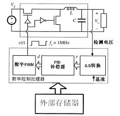 隨著數(shù)字芯片和電源技術(shù)的發(fā)展,現(xiàn)在出現(xiàn)了為電源控制而開發(fā)出來的控制處理器,它不同于數(shù)字芯片的中央處理器??刂铺幚砥髦饕筛咚貯D轉(zhuǎn)換器,數(shù)字PID補償器和數(shù)字PWM輸出三部分組成。反饋環(huán)路的控制由它來完成,中央處理器作為管理模塊應(yīng)用在電源上。其原理圖如圖3所示: