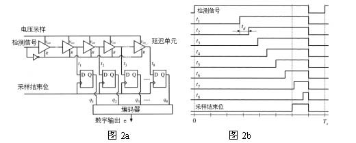 控制處理器由高速A/D轉(zhuǎn)換器,數(shù)字PID補償器和數(shù)字DPWM輸出組成。外部存儲器記錄了控制處理器的相關(guān)程序。高速A/D轉(zhuǎn)換器是基于CMOS的傳輸延遲時間td 影響輸入電壓VDD的原理做成的,VDD電壓和傳輸時間是成近似的反比例關(guān)系,即VDD越大,信號傳輸延遲時間越小。如圖2所示,以CMOS的輸入電壓VDD作位采樣電壓的輸入口,各信號之間的傳輸時間延時td受采樣電壓VDD影響。第四分之三個采樣周期過后采樣結(jié)束位產(chǎn)生高電平,開始記錄q1到q8的輸出,把得到的結(jié)果送入編碼器得到數(shù)字輸出e,完成A/D轉(zhuǎn)換。如圖2b所示,數(shù)字采樣值為11111100.VDD越大,td越小得到的采樣值越大。