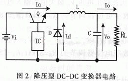圖2所示為降壓型DC-DC變換器的典型電路,當(dāng)控制器IC感應(yīng)到輸出電壓Vo太低時,啟動通道上的晶體管Q給電感器L充電,同時也對電容器C充電,當(dāng)輸出電壓V0上升到一個預(yù)定值時,控制器關(guān)閉通道上的晶體管Q,電感器L和電容器C上獲取的能量通過肖特基二極管構(gòu)成的回路自由釋放,從電感器L到電容器C進行有效的能量傳輸會消耗一部分能量,因此加載在負載上的電壓有所下降。