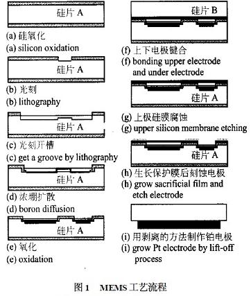 硅電容式壓力傳感器的敏感元件是半導體薄膜,它可以由單晶硅、多晶硅等利用半導體工藝制作而成。典型的電容式傳感器由上下電極、絕緣體和襯底構成。當薄膜受壓力作用時,薄膜會發(fā)生一定的變形,因此,上下電極之間的距離發(fā)生一定的變化,從而使電容發(fā)生變化。但電容式壓力傳感器的電容與上下電極之間的距離的關系是非線性關系,因此,要用具有補償功能的測量電路對輸出電容進行非線性補償。由于高溫壓力傳感器工作在高溫環(huán)境下,補償電路會受到環(huán)境溫度的影響,從而產(chǎn)生較大的誤差?;谀P妥R別的高溫壓力傳感器,正是為了避免補償電路在高溫環(huán)境下工作產(chǎn)生較大誤差而設計的,其設計方案是把傳感器件與放大電路分離,通過模型識別來得到所測環(huán)境的壓力。高溫工作區(qū)溫度可達350℃。傳感器件由鉑電阻和電容式壓力傳感器構成。其MEMS工藝如下: